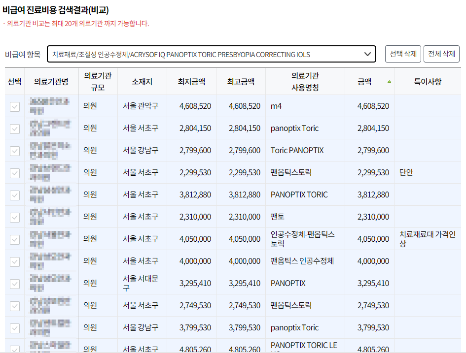 이 처럼 각 지역 시/군/동 단위까지 의료기관 별 가격을 확인할 수 있으니 꼭 해당 사이트로 이동하셔서 우리 동네 백내장 수술 가격을 확인하시기 바랍니다. 위에서 보시는 것과 같이 최대 100만원 이상 차이가 나고 있으니 꼭 확인하시기 바랍니다.