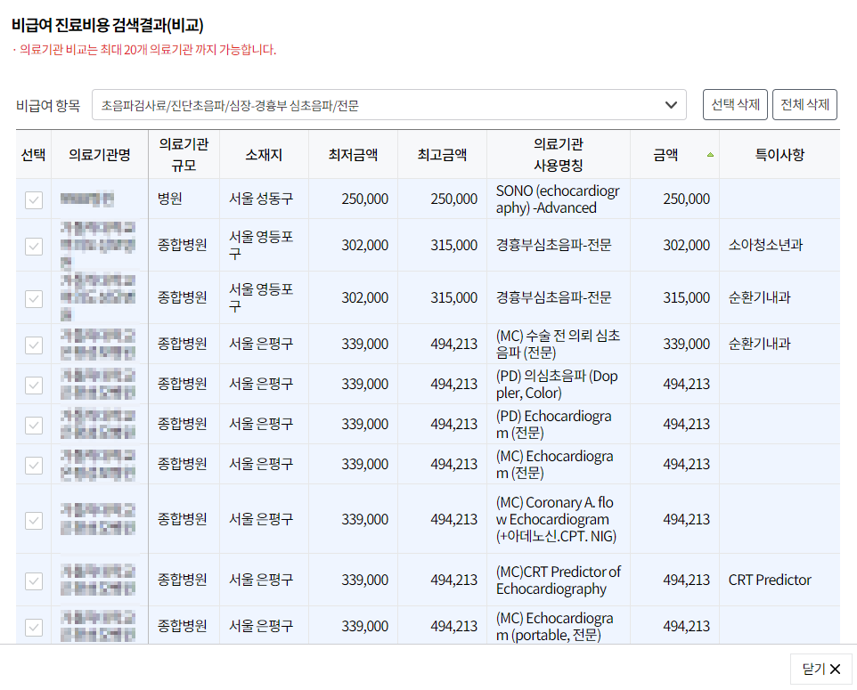 서울로 검색했을 경우 아래와 같이 확인됩니다. 의료기관 별 심장 초음파 검사 비용을 확인 할 수 있습니다.