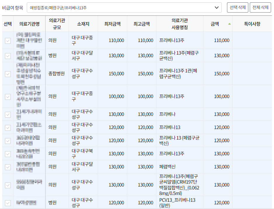 대구 폐렴구균 예방접종 비용